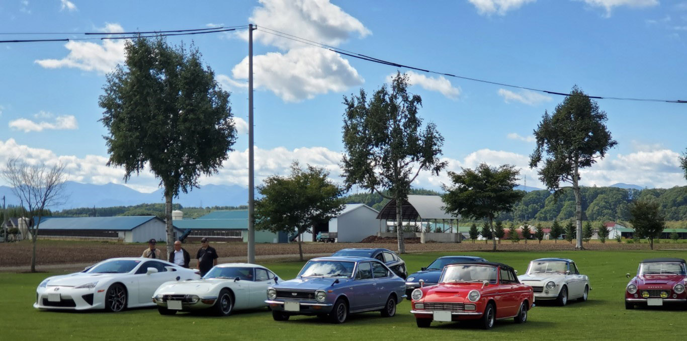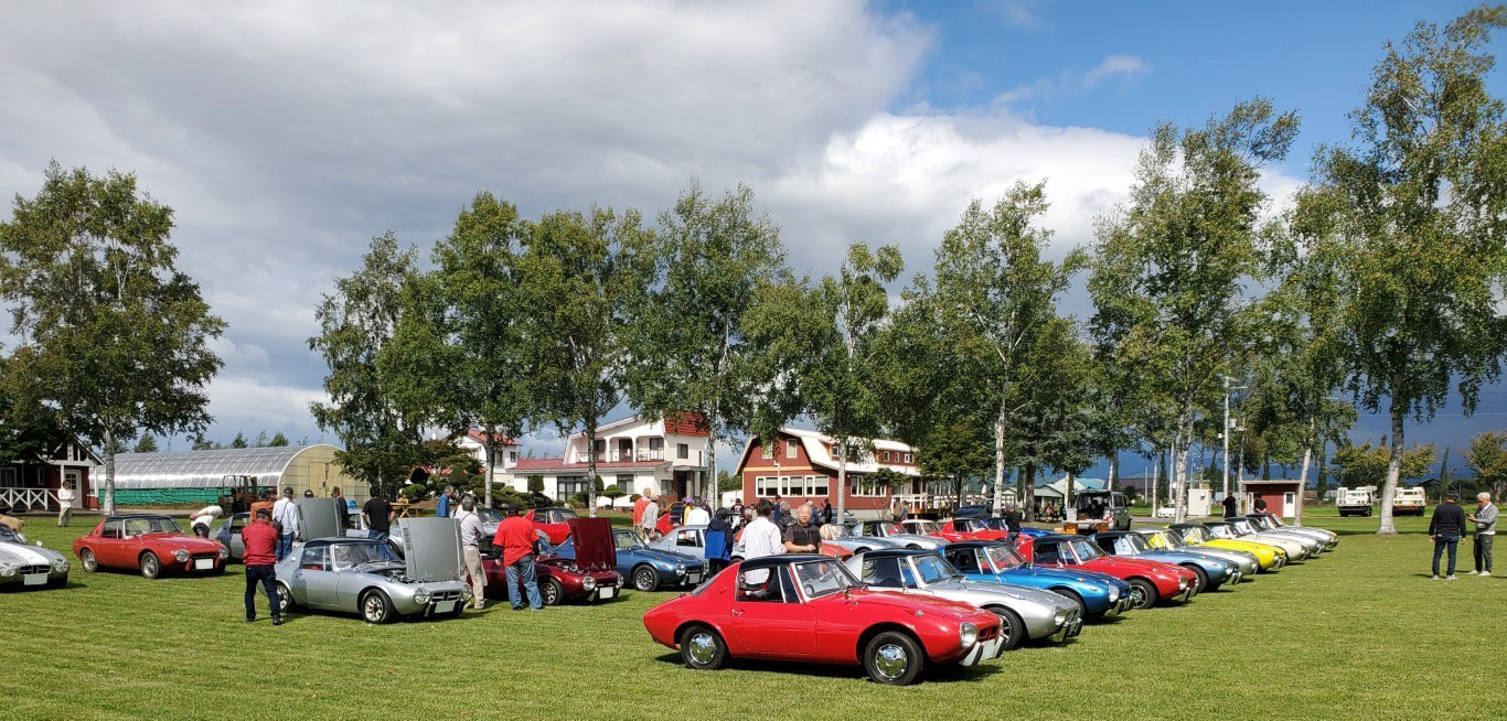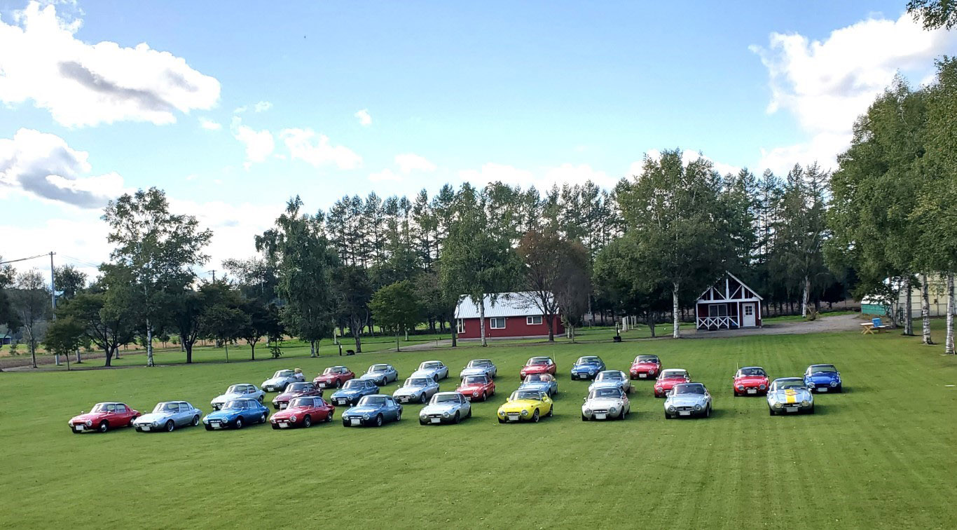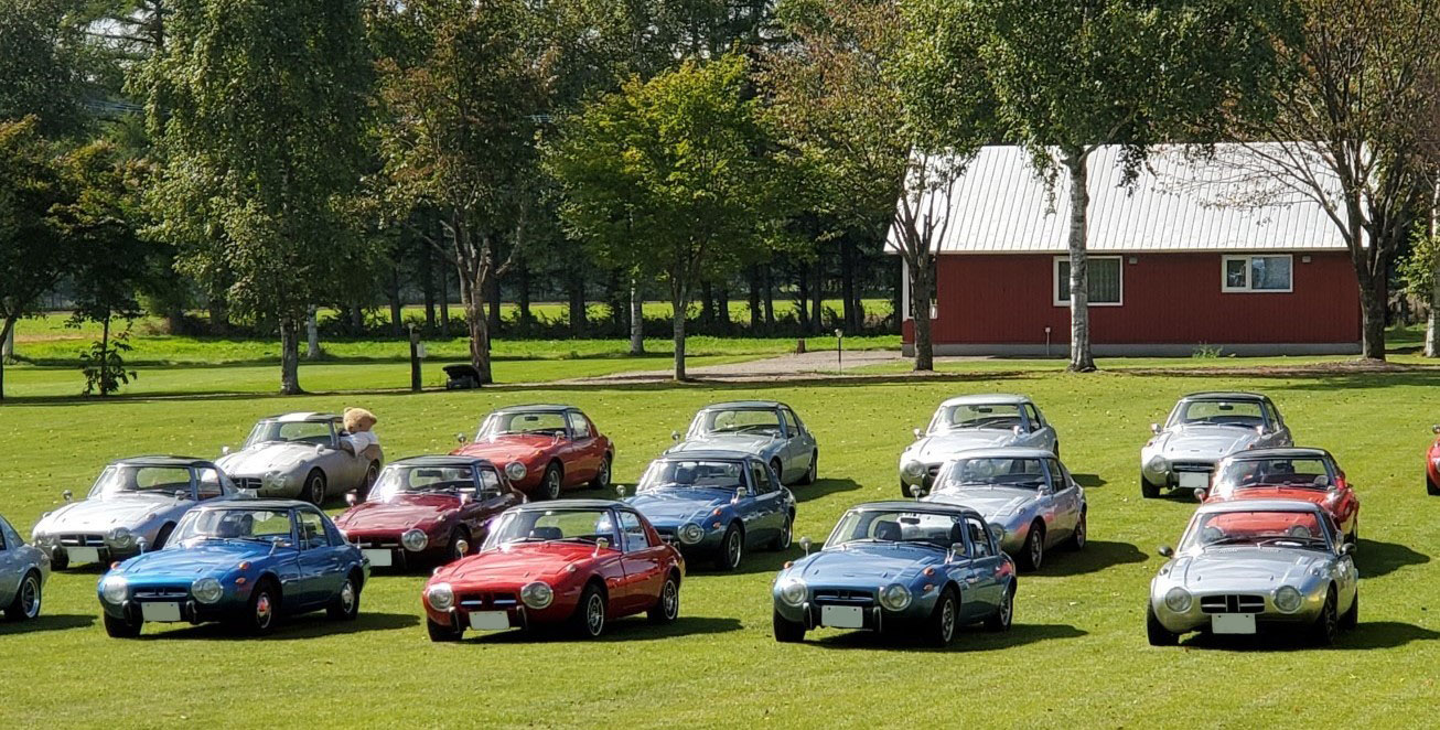その後、屋外の広い芝生に戻り、クルマの全体写真と参加者の集合写真を撮り、情報交換を。