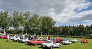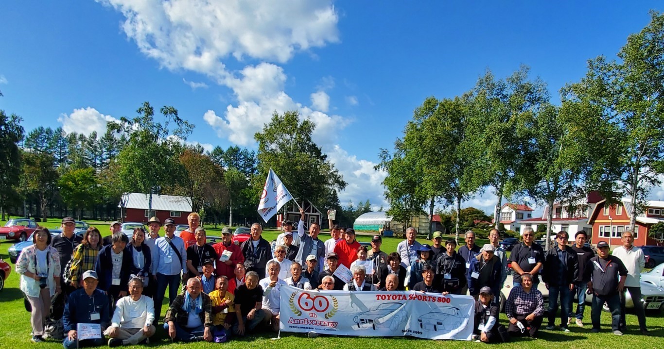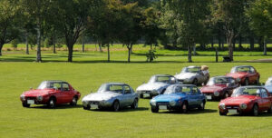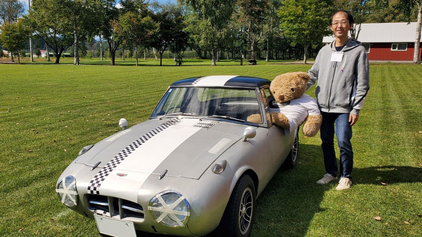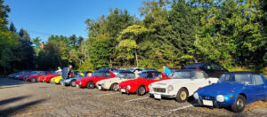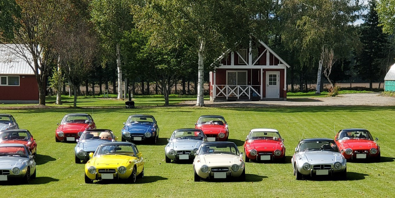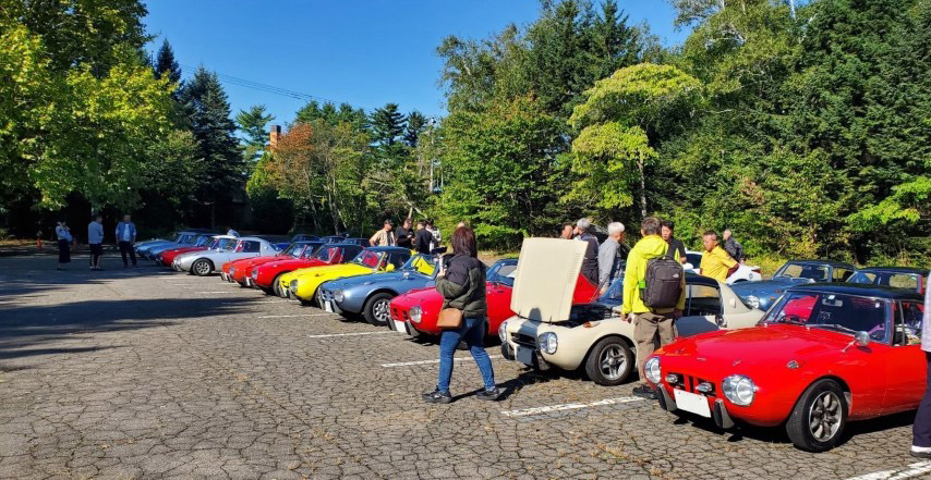 その後、屋外の広い芝生に戻り、クルマの全体写真と参加者の集合写真を撮り、情報交換を。