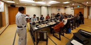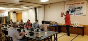 カローラ福島 福島店の室内で協議会とカローラ福島の代表の挨拶のあと、オーナーの活動報告(東北にもヨタハチハウス!?)を行いました。